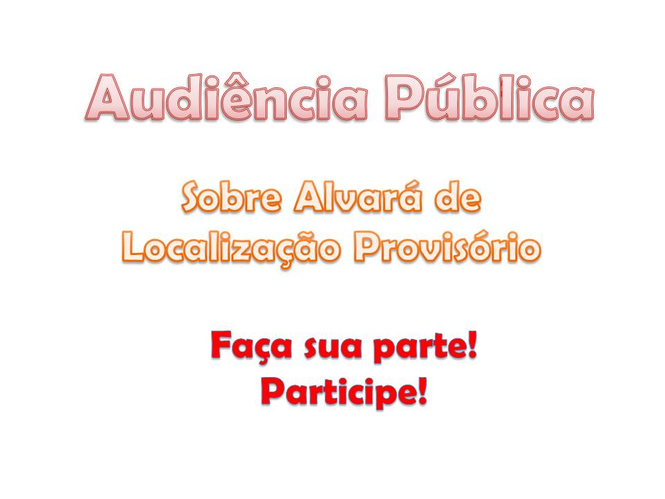 A Câmara de Vereadores de Estrela Velha realizará Audiência Pública no dia 08 de junho, às 19horas, na Sala de Sessões Erno Billig, para tratar sobre a concessão do Alvará de Localização Provisório para o funcionamento e instalação de atividades econômicas, do Município de Estrela Velha.