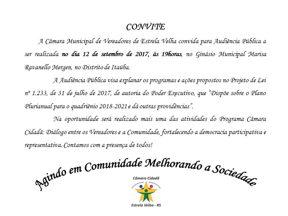 Quarta, 18 Dezembro 2019 CÂMARA DE VEREADORES DE ESTRELA VELHA Nesta sexta-feira, 20 de dezembro, será realizada A ÚLTIMA SESSÃO ORDINÁRIA DE 2019, com a eleição da Mesa Diretora para o ano de 2020, conforme Lei Orgânica Municipal e Regimento Interno. Foi protocolada a Chapa 2: CHAPA 2: Presidente: Ildo Nagorsny; Vice-Presidente: Isabela Garcia; 1º Secretário:...